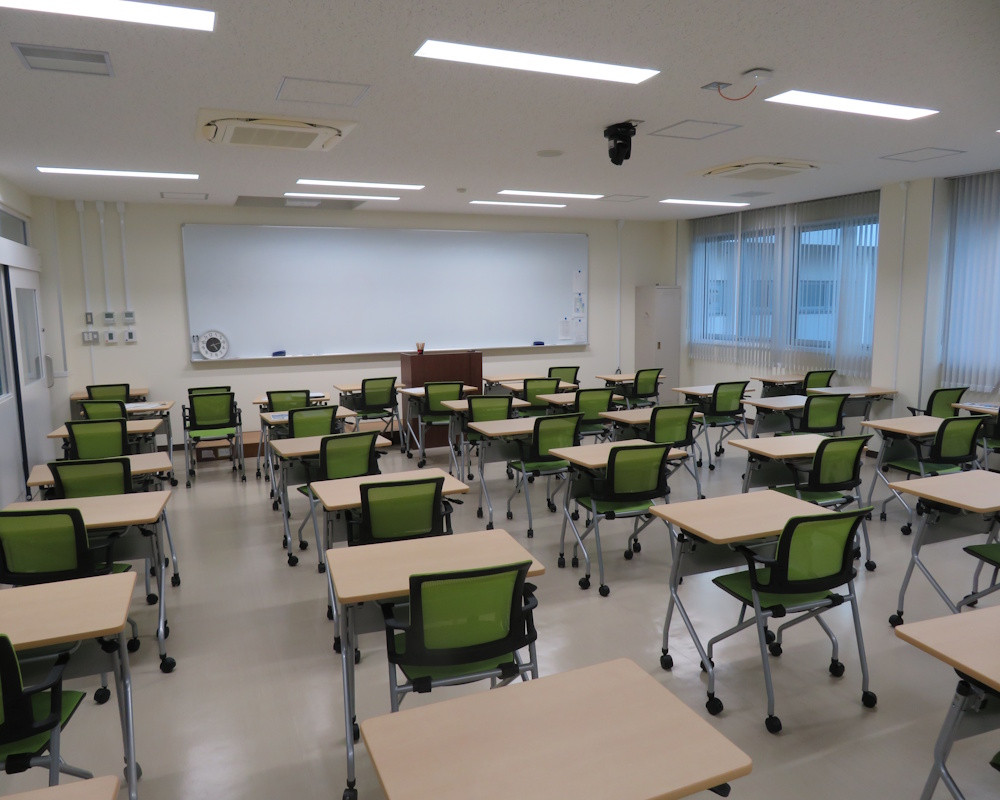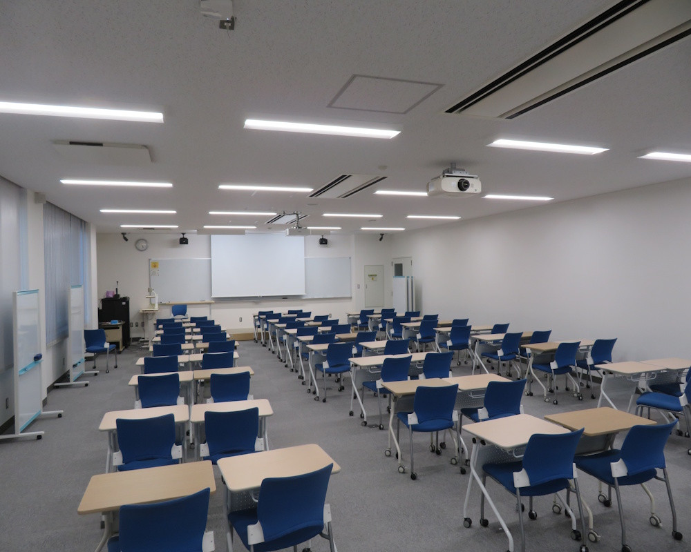 定員を十分収容できる広い講義室・演習室内に大きなホワイトボートを設置し、液晶プロジェクタや無線APを整備しています。