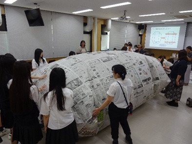 担当教員の説明の下、4つのチームに分かれて新聞紙を幅50 mmのOPPテープで貼り合わせていきました。最初は、どのチームも貼り合わせる作業に苦労していましたが、本校学生の応援をもらって無事作業をこなしていきました。