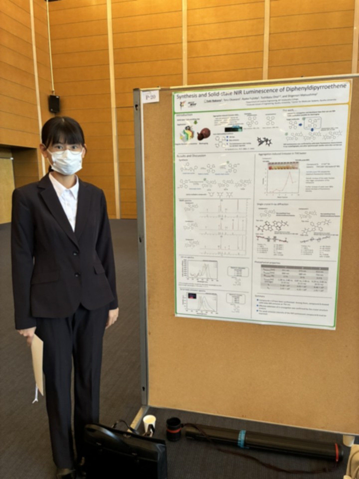 受賞した研究は、生体内の観察や病気の診断に応用が期待される「近赤外光」を発する新しい蛍光色素の合成と、その詳細な評価に関するものです。中野さんは、本研究内容を英語で発表しました。