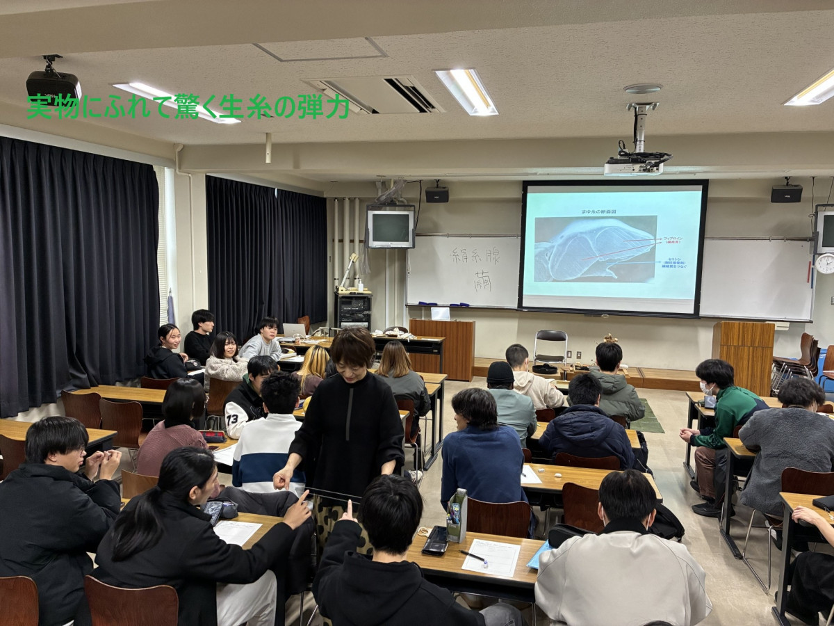 授業では、絹の反物や繭、生糸、真綿などの実物に学生全員が触れながら、動画やスライドを用いて製糸の仕組みを学びました。さらに、糸の座繰り(繭から糸を引き出す作業)の実演を間近で見学し、学生も糸繰りに挑戦しました。座繰り器の動きをじっと観察し、その仕組みに興味を示す姿も見られました。